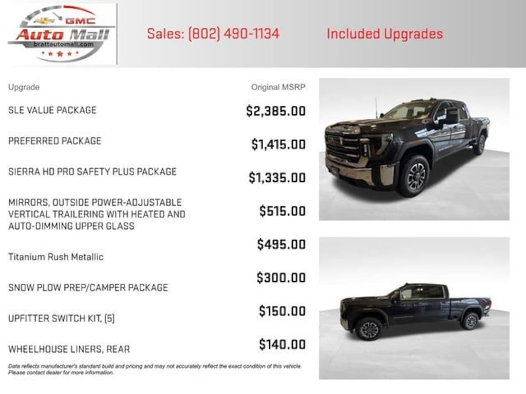 This NEW 2025 Titanium Rush Metallic GMC Sierra 3500HD SLE 4WD is well equipped and includes these features and benefits: Cloth Rear Seat w/Storage Package, Preferred Equipment Group 3SA (120-Volt Bed Mounted Power Outlet, 120-Volt Instrument Panel Power Outlet, 2 Charge-Only Rear USB Ports, 2 Charge/Data USB Ports, 2-Speed Electronic Shift Transfer Case, 4-Way Manual Driver Seat Adjuster, Chrome Surround Grille w/Chrome Insert Bars, Deep-Tinted Glass, Keyless Open & Start, Push Button Start, SiriusXM w/360L Trial Subscription, Steering Wheel Audio Controls, and Wireless Phone Projection), Preferred Package (Adaptive Cruise Control, Hitch Guidance w/Hitch View, LED Cargo Area Lighting, Power Sliding Rear Window w/Defogger, and Universal Home Remote), Remote Start Package (Electric Rear-Window Defogger, Remote Vehicle Starter System, and Unauthorized Entry Theft-Deterrent System), Sierra HD Pro Safety Plus Package (Bed View Camera w/2 Trailer Camera Provisions, HD Surround Vision, Rear Cross Traffic Alert, Trailer Camera Provisions, Trailer Side Blind Zone Alert, and Ultrasonic Front & Rear Park Assist), SLE Convenience Package (10-Way Power Driver Seat Adjuster w/Lumbar, Dual-Zone Automatic Climate Control, LED Fog Lamps, and Manual Tilt-Wheel/Telescoping Steering Column), SLE Heated Package (Heated Driver & Front Outboard Passenger Seats and Heated Steering Wheel), SLE Value Package (Spray-On Pickup Bedliner w/GMC Logo), Snow Plow Prep/Camper Package (220 Amp Alternator), Suspension Package, 10-Speed Automatic, 4WD, Black Cloth, 18 Machined Aluminum Wheels, 3.73 Rear Axle Ratio, 4-Way Manual Passenger Seat Adjuster, 4-Wheel Disc Brakes, 6 Speakers, 6-Speaker Audio System Feature, ABS brakes, Air Conditioning, Alloy wheels, AM/FM radio: SiriusXM with 360L, Auto High-beam Headlights, Auto-Dimming Inside Rear-View Mirror, Automatic Emergency Braking, Brake assist, Buckle to Drive, Bumpers: chrome, Cloth Seat Trim, Compass, Delay-off headlights, Driver door bin, Driver vanity mirror, Dual front impact airbags, Dual front side impact airbags, Electronic Stability Control, Exterior Parking Camera Rear, Following Distance Indicator, Forward Collision Alert, Front 40/20/40 Split-Bench Seats w/Lockable Storage, Front anti-roll bar, Front Center Armrest w/Storage, Front License Plate Kit, Front Pedestrian Braking, Front reading lights, Front wheel independent suspension, Fully automatic headlights, GMC Premium 13.4 Diagonal Information Display, Heated door mirrors, Heavy-Duty 80 Amp-Hr Battery, Illuminated entry, In-Vehicle Trailering App, IntelliBeam Automatic High Beam On/Off, Lane Departure Warning System, LED Smoked Amber Roof Marker Lamps, Low tire pressure warning, Occupant sensing airbag, Outside temperature display, Overhead airbag, Overhead console, Panic alarm, Passenger door bin, Passenger vanity mirror, Perimeter Lighting, Pickup Bed, Power door mirrors, Power steering, Power windows, Power-Adjustable Black Outside Mirrors, Radio: AM/FM w/Premium GMC Infotainment System, Rear reading lights, Rear step bumper, Rear Wheelhouse Liners, Remote keyless entry, Speed control, Split folding rear seat, Steering wheel mounted audio controls, Tachometer, Tilt steering wheel, Traction control, Trip computer, Turn signal indicator mirrors, Upfitter Switch Kit (5), Variably intermittent wipers, and Voltmeter.
