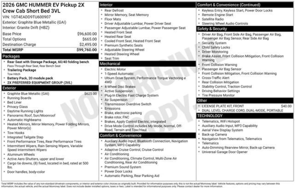 This NEW 2026 Graphite Blue Metallic GMC Hummer EV Pickup 2X AWD is well equipped and includes these features and benefits: 12-Way Power Driver Seat Adjuster, 12-Way Power Passenger Seat Adjuster, 13.26 Final Drive Ratio, 14 Speakers, 4-Wheel Disc Brakes, 5G Vehicle Connectivity, ABS brakes, Adaptive suspension, Air Conditioning, Alloy wheels, AM/FM radio: SiriusXM with 360L, Auto High-beam Headlights, Auto-dimming door mirrors, Auto-dimming Rear-View mirror, Automatic temperature control, Bose Premium 14-Speaker Surround Sound System, Brake assist, Compass, Delay-off headlights, Driver door bin, Driver vanity mirror, Dual front impact airbags, Dual front side impact airbags, Electronic Stability Control, Emergency communication system: OnStar, Four wheel independent suspension, Front and Rear Air Ride Adaptive Suspension, Front anti-roll bar, Front Bucket Seats, Front Bucket Seats with Center Console, Front Center Armrest, Front dual zone A/C, Front License Plate Kit, Front reading lights, Garage door transmitter, Google Automotive Services Capable, Heated door mirrors, Heated Driver and Front Passenger Seats, Heated front seats, Heated rear seats, Heated steering wheel, Illuminated entry, Low tire pressure warning, Memory seat, Navigation System, Occupant sensing airbag, Outside temperature display, Overhead console, Panic alarm, Passenger door bin, Passenger vanity mirror, Power door mirrors, Power driver seat, Power passenger seat, Power steering, Power windows, Premium Leather-Alternative Seating Surfaces, Radio data system, Radio: 13.4 Diagonal Premium GMC Infotainment System, Rain sensing wipers, Rear air conditioning, Rear reading lights, Rear seat center armrest, Rear window defroster, Remote keyless entry, Security system, SiriusXM with 360L Trial Subscription, Speed control, Speed-sensing steering, Split folding rear seat, Steering wheel memory, Steering wheel mounted audio controls, Telescoping steering wheel, Tilt steering wheel, Traction control, Trip computer, Variably intermittent wipers, Ventilated Driver and Front Passenger Seats, Ventilated front seats, and Wheels: 22 x 9.5 Gloss Black Painted Aluminum.