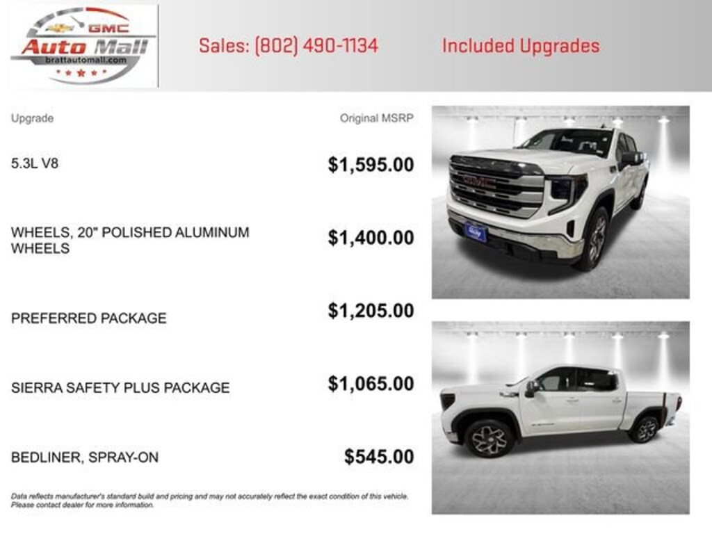 This NEW 2026 Summit White GMC Sierra 1500 SLE 4WD is well equipped and includes these features and benefits: High Capacity Suspension Package, Preferred Equipment Group 3SA (10-Way Power Driver Seat Adjuster with Lumbar, 120-Volt Bed Mounted Power Outlet, 120-Volt Interior Power Outlet, 2 Charge/Data USB Ports, 2 Type-C Charge-Only Rear USB Ports, 4-Way Manual Passenger Seat Adjuster, Chrome Header with Medium Silver Grille Insert Bars, Color-Keyed Carpeting Floor Covering, Deep-Tinted Glass, Front 40/20/40 Split-Bench Seat, Front Frame-Mounted Black Recovery Hooks, Front Rubberized-Vinyl Floor Mats, HD Rear Vision Camera, Heated Driver and Front Outboard Passenger Seating, Integrated Trailer Brake Controller, Keyless Open and Start, Manual Tilt-Wheel and Telescoping Steering Column, OnStar Services Capable, Power Door Locks, Power Front Windows with Driver Express Up/Down, Power Front Windows with Passenger Express Down, Power Rear Windows with Express Down, Push Button Start, Rear Rubberized-Vinyl Floor Mats, SiriusXM with 360L Trial Subscription, Steering Wheel Audio Controls, Wheels: 17 x 8 Bright Silver Painted Aluminum, and Wi-Fi Hotspot Capable), Preferred Package (Adaptive Cruise Control, Hitch View, in-Vehicle Trailering System App, Power Sliding Rear Window with Rear Defogger, Rear Wheelhouse Liners, and Universal Home Remote), Remote Start Package (Electric Rear-Window Defogger, Remote Vehicle Starter System, and Theft Deterrent System (unauthorized Entry)), Sierra Safety Plus Package (HD Surround Vision, Perimeter Lighting, Rear Cross Traffic Braking, Rear Pedestrian Detection, Trailer Camera Provisions, Trailer Side Blind Zone Alert, and Ultrasonic Front and Rear Park Assist), SLE Convenience Package (Dual-Zone Automatic Climate Control and LED Cargo Area Lighting), SLE Value Package (Auto-Locking Rear Differential), Standard Suspension Package, Trailering Package (Hitch Guidance), 10-Speed Automatic, 4WD, Black Cloth, 170 Amp Alternator, 20 Polished Aluminum Wheels, 220 Amp Alternator, 3.23 Rear Axle Ratio, 4-Wheel Disc Brakes, 6 Speakers, 6-Speaker Audio System Feature, ABS brakes, Air Conditioning, Alloy wheels, AM/FM radio: SiriusXM with 360L, Apple CarPlay/Android Auto, Auto High-beam Headlights, Automatic Emergency Braking, Automatic temperature control, Auxiliary External Transmission Oil Cooler, Brake assist, Buckle to Drive, Bumpers: chrome, Cloth Seat Trim, Compass, Delay-off headlights, Driver door bin, Driver vanity mirror, Dual front impact airbags, Dual front side impact airbags, Electronic Stability Control, Emergency communication system: OnStar, External Engine Oil Cooling, Following Distance Indicator, Forward Collision Alert, Front anti-roll bar, Front Center Armrest w/Storage, Front dual zone A/C, Front License Plate Kit, Front Pedestrian Braking, Front reading lights, Front wheel independent suspension, Fully automatic headlights, Heated door mirrors, Heated front seats, Heated steering wheel, Illuminated entry, IntelliBeam Automatic High Beam on/Off, Lane Keep Assist with Lane Departure Warning, Low tire pressure warning, Navigation System, Occupant sensing airbag, Outside temperature display, Overhead airbag, Overhead console, Panic alarm, Passenger door bin, Passenger vanity mirror, Power door mirrors, Power driver seat, Power steering, Power windows, Radio data system, Radio: Premium GMC Infotainment Audio System, Rear reading lights, Rear step bumper, Rear window defroster, Remote keyless entry, Security system, Speed control, Speed-sensing steering, Split folding rear seat, Spray-on Pickup Bedliner with GMC Logo, Steering wheel mounted audio controls, Tachometer, Telescoping steering wheel, Tilt steering wheel, Traction control, Trip computer, Variably intermittent wipers, Voltmeter, and Wireless Apple CarPlay/Wireles