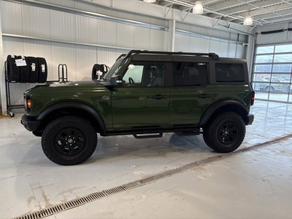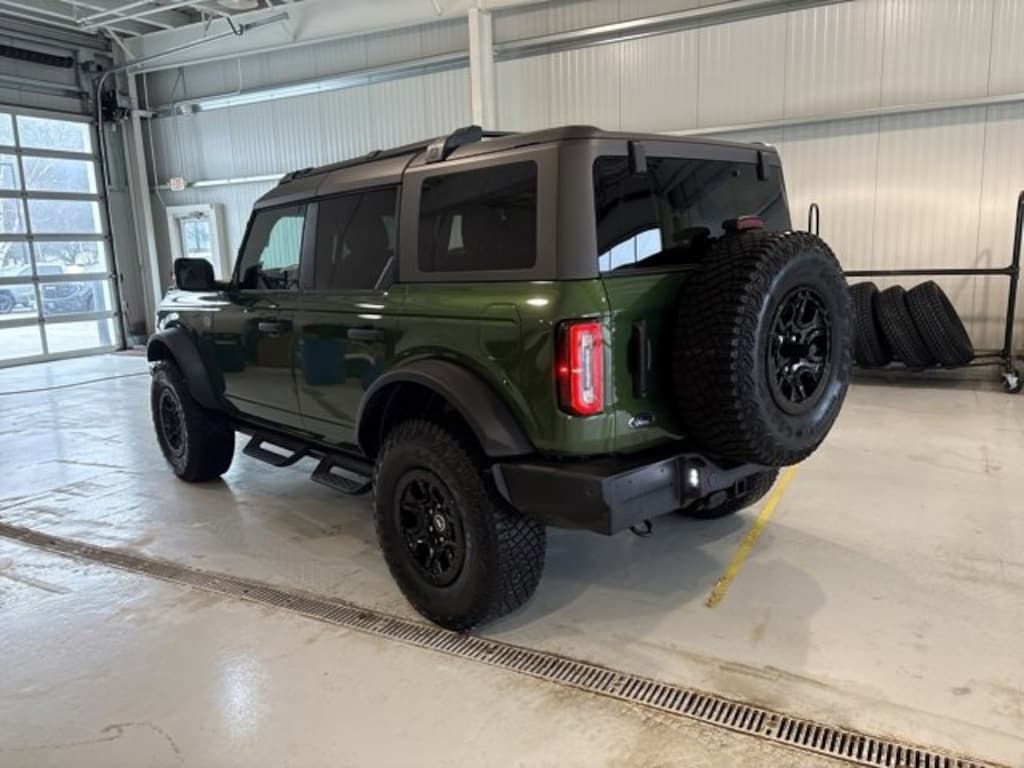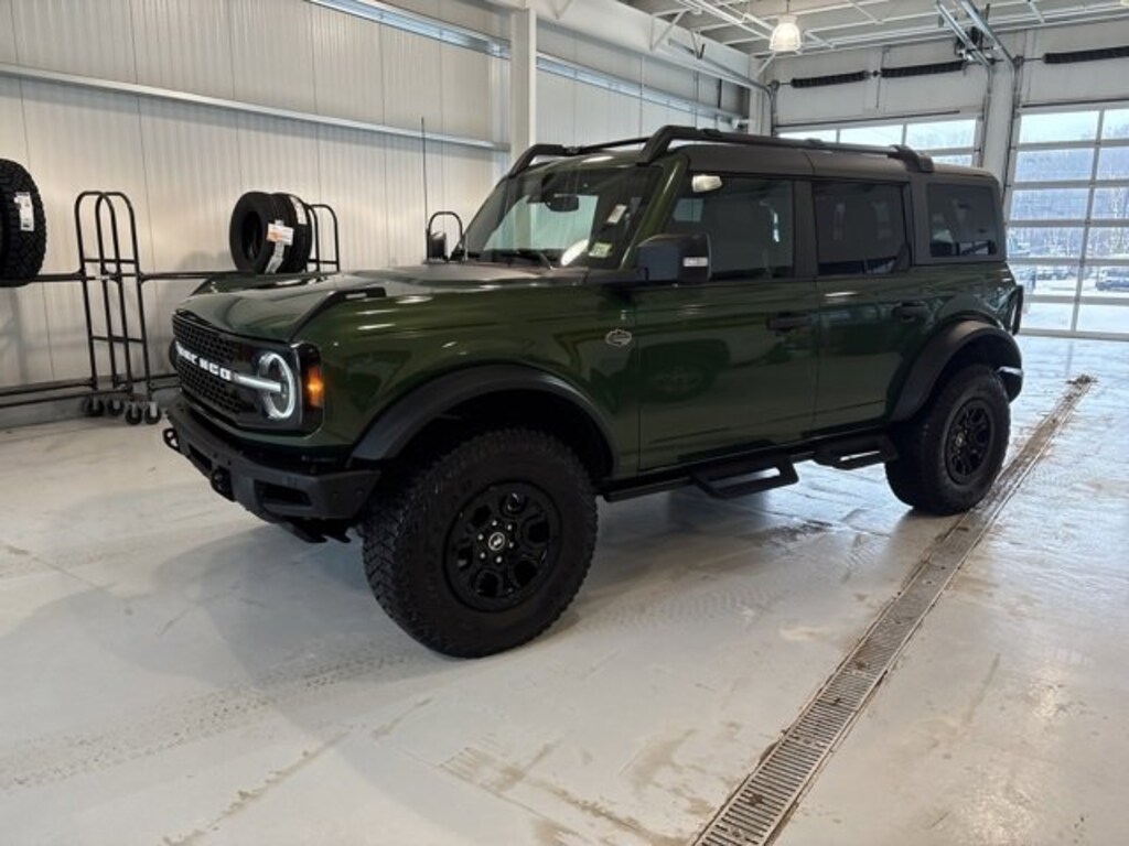 This 2024 Eruption Green Metallic Ford Bronco Wildtrak 4WD is well equipped and includes these features and benefits: Equipment Group 354A High/Lux Package (10 Speakers w/Subwoofer, 360-Degree Camera, Adaptive Cruise Control, Additional Sound Deadening, Evasive Steering Assist, Front Parking Sensors, Heated Steering Wheel, Information on Demand Panel, Radio: B&O Sound System by Bang & Olufsen, Sideview Mirrors, Universal Garage Door Opener, and Wireless Charging Pad), Trailer Tow Package (DIO), 4-Wheel Disc Brakes, 4.7 Axle Ratio, 7 Speakers, ABS brakes, Air Conditioning, Alloy wheels, AM/FM radio: SiriusXM with 360L, AM/FM Stereo, Auto High-beam Headlights, Auto-dimming Rear-View mirror, Automatic temperature control, Brake assist, Carbonized Gray Molded-In-Color Hard Top, Compass, Connected Navigation, Delay-off headlights, Driver door bin, Driver vanity mirror, Dual front impact airbags, Dual front side impact airbags, Electronic Stability Control, Emergency communication system: 911 Assist, Exterior Parking Camera Rear, Front & Rear Floor Liners w/o Carpet Floor Mats, Front anti-roll bar, Front Bucket Seats, Front Center Armrest, Front dual zone A/C, Front fog lights, Front reading lights, Front Row Top Panels & Door Storage Bags, Front Row Top Panels Storage Bag, Front wheel independent suspension, Fully automatic headlights, Hard Top Sound Deadening Headliner, Heated door mirrors, Heated front seats, Heated Leather-Trimmed/Vinyl Bucket Seats, Illuminated entry, Integrated roll-over protection, Leather Shift Knob, Low tire pressure warning, Navigation system: Connected Navigation, Occupant sensing airbag, Outside temperature display, Overhead airbag, Overhead console, Panic alarm, Passenger door bin, Passenger vanity mirror, Power door mirrors, Power steering, Power windows, Radio data system, Rear-Window Defroster & Washer, Remote keyless entry, Removable Hoop Step, Second Row Panel Roof Bag Storage (DIO), Security system, SiriusXM Radio w/360L, Speed control, Split folding rear seat, Steering wheel mounted audio controls, SYNC 4, Tachometer, Telescoping steering wheel, Tilt steering wheel, Traction control, Trip computer, Variably intermittent wipers, Voltmeter, and Wheels: 17 Black High Gloss-Painted Aluminum. CARFAX One-Owner. Clean CARFAX.