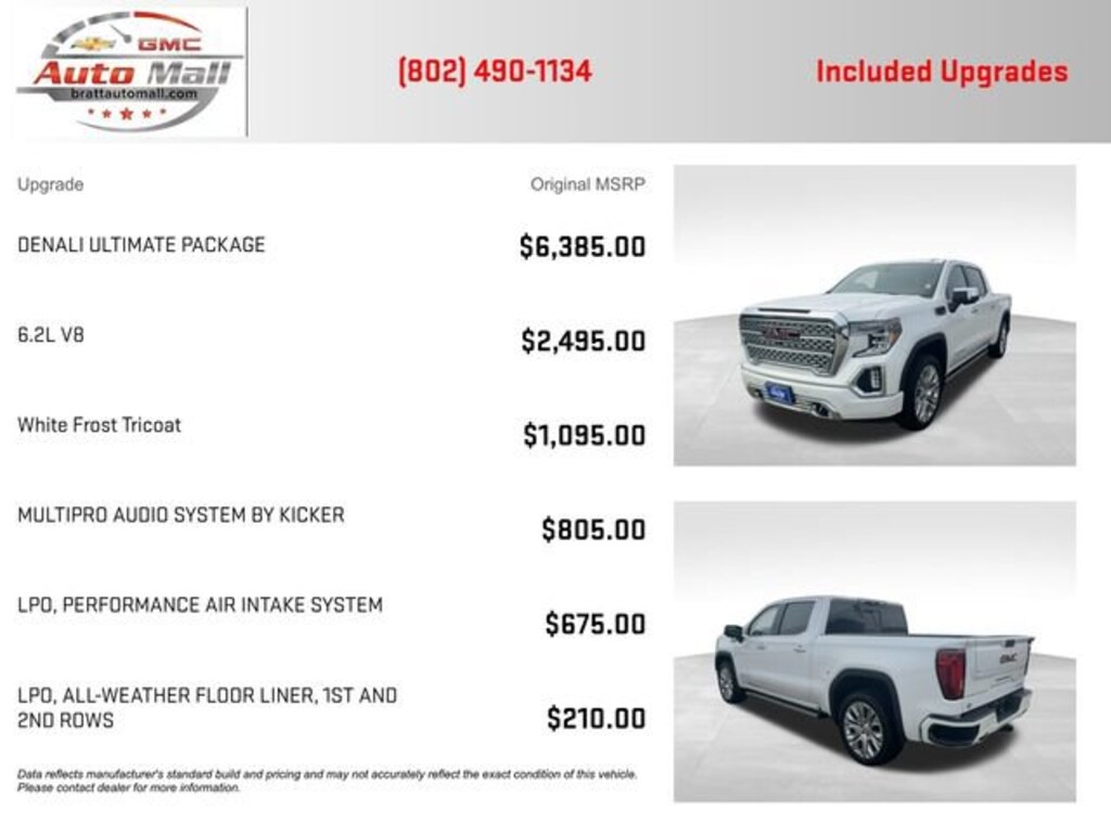 Priced below KBB Fair Purchase Price! This 2020 White Frost Tricoat GMC Sierra 1500 Denali 4WD is well equipped and includes these features and benefits: Denali Ultimate Package (Power Sunroof), Driver Alert Package I (Lane Change Alert w/Side Blind Zone Alert, Rear Cross Traffic Alert, and Ultrasonic Front & Rear Park Assist), Driver Alert Package II (Adaptive Cruise Control - Camera, Automatic Emergency Braking, Following Distance Indicator, Forward Collision Alert, Front Pedestrian Braking, IntelliBeam Automatic High Beam On/Off, and Lane Keep Assist w/Lane Departure Warning), Preferred Equipment Group 5SA (12-Volt Rear Auxiliary Power Outlet, 120-Volt Bed Mounted Power Outlet, 120-Volt Instrument Panel Power Outlet, 170 Amp Alternator, 2 USB Ports, 2 USB Ports (1st Row), 4G LTE Wi-Fi Hotspot Capable, Auxiliary External Transmission Oil Cooler, Chrome Recovery Hooks, Chrome Wheel To Wheel Assist Steps, Color-Keyed Carpeting Floor Covering, Compass, Deep-Tinted Glass, Electric Rear-Window Defogger, Electrical Lock Control Steering Column, Floor-Mounted Center Console, GMC Connected Access Capable, HD Radio, HD Rear Vision Camera, Heated 2nd Row Outboard Seats, Heated Driver & Front Outboard Passenger Seating, Heavy-Duty Rear Locking Differential, High-Capacity Air Filter, Hill Descent Control, Hitch Guidance, Hitch Guidance w/Hitch View, In-Vehicle Trailering App, Integrated Trailer Brake Controller, Keyless Open & Start, LED Cargo Area Lighting, Manual Tilt-Wheel & Telescoping Steering Column, OnStar & GMC Connected Services Capable, Power Door Locks, Power Front Passenger Windows w/Express Up/Down, Power Front Windows w/Driver Express Up/Down, Power Rear Windows w/Express Down, Power Sliding Rear Window w/Rear Defogger, ProGrade Trailering System, Rear Dual USB Charging-Only Ports, Rear Wheelhouse Liners, Remote Vehicle Starter System, Safety Alert Seat, Signature Denali Grille, Spray-On Pickup Bed Liner w/Denali Logo, Steering Wheel Audio Controls, Theft Deterrent System (Unauthorized Entry), Universal Home Remote, Ventilated Driver & Front Passenger Seats, and Wireless Charging), Technology Package (Bed View Camera, HD Surround Vision w/2 Trailer View Camera Provisions, Multicolor 15 Diagonal Head-Up Display, and Rear Camera Mirror), Trailering Package, 10-Speed Automatic, 4WD, Jet Black Leather, 10-Way Power Driver Seat Adjuster w/Lumbar, 10-Way Power Passenger Seat Adjuster w/Lumbar, 3.23 Rear Axle Ratio, 4-Wheel Disc Brakes, 7 Speakers, ABS brakes, Adaptive Ride Control Suspension, Adaptive suspension, Air Conditioning, All-Weather Floor Liner (LPO), Alloy wheels, AM/FM radio: SiriusXM with 360L, Apple CarPlay/Android Auto, Auto-dimming door mirrors, Auto-dimming Rear-View mirror, Automatic temperature control, Brake assist, Bumpers: body-color, Delay-off headlights, Driver door bin, Driver Memory, Driver vanity mirror, Dual front impact airbags, Dual front side impact airbags, Electronic Stability Control, Forge Perforated Leather-Appointed Seat Trim, Front anti-roll bar, Front Bucket Seats, Front Center Armrest, Front dual zone A/C, Front fog lights, Front License Plate Kit, Front reading lights, Front wheel independent suspension, Fully automatic headlights, Garage door transmitter, Genuine wood console insert, Genuine wood door panel insert, GMC MultiPro Power Steps (DISC), Heated door mirrors, Heated front seats, Heated rear seats, Heated steering wheel, Illuminated entry, Low tire pressure warning, Memory seat, MultiPro Audio System by Kicker, Navigation System, Occupant sensing airbag, Outside temperature display, Overhead airbag, Overhead console, Panic alarm, Passenger door bin, Passenger vanity mirror, Performance Air Intake System (LPO), Power door mirrors, Power driver seat, Power passenger seat, Power steering, Power windows, Premium audio system: GMC Infotainment System, Premium Bose 7-Speaker Sound System, Radio data system, Radio: Premium GMC Infotainme