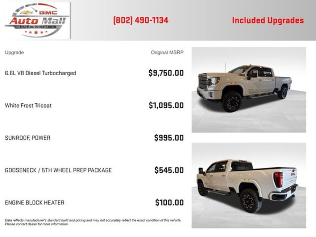 This 2022 White Frost Tricoat GMC Sierra 3500HD Denali 4WD is well equipped and includes these features and benefits: Driver Alert Package I (Lane Change Alert w/Side Blind Zone Alert and Rear Cross Traffic Alert), Driver Alert Package II (Automatic Emergency Braking, Following Distance Indicator, Forward Collision Alert, IntelliBeam Automatic High Beam On/Off, and Lane Departure Warning System), Gooseneck/5th Wheel Prep Package, Preferred Equipment Group 5SA (12-Volt Rear Auxiliary Power Outlet, 120-Volt Bed Mounted Power Outlet, 120-Volt Instrument Panel Power Outlet, 2 USB Ports (First Row), 2 USB Ports Inside Console, 2-Speed Active Transfer Case, 2nd Row Dual USB Charge-Only Ports, 6 Rectangular Chromed Tubular Assist Steps, Bed View Camera w/2 Trailer Camera Provisions, Compass Located In Instrument Cluster, Deep-Tinted Glass, Electric Rear-Window Defogger, Electrical Lock Control Steering Column, Floor-Mounted Center Console, Front Chrome Recovery Hooks, GMC Connected Access Capable, HD Rear Vision Camera, HD Surround Vision w/2 Trailer View Camera Provisions, Heated Driver & Front Outboard Passenger Seats, Hitch Guidance w/Hitch View, In-Vehicle Trailering System App, Integrated Trailer Brake Controller, Keyless Open & Start, LED Cargo Area Lighting, Manual Tilt-Wheel/Telescoping Steering Column, OnStar & GMC Connected Services Capable, Polished Exhaust Tip, Power Door Locks, Power Front Passenger Windows w/Express Up/Down, Power Front Windows w/Driver Express Up/Down, Power Rear Windows w/Express Down, Power Sliding Rear Window w/Defogger, ProGrade Trailering System, Rear Wheelhouse Liners, Remote Vehicle Starter System, Safety Alert Seat, Signature Denali Grille w/High Gloss Black Mesh, Spray-On Pickup Bed Liner w/Denali Logo, Steering Wheel Audio Controls, Unauthorized Entry Theft-Deterrent System, Universal Home Remote, Ventilated Driver & Front Passenger Seats, Wi-Fi Hotspot Capable, Wireless Charging, and Wireless Phone Projection), Snow Plow Prep/Camper Package (220 Amp Alternator), X31 Off-Road Package (Hill Descent Control), 10-Speed Automatic, 4WD, Jet Black Leather, 10-Way Power Driver Seat Adjuster w/Lumbar, 10-Way Power Passenger Seat Adjuster w/Lumbar, 4-Wheel Disc Brakes, 7 Speakers, ABS brakes, Air Conditioning, Alloy wheels, AM/FM radio: SiriusXM with 360L, Apple CarPlay/Android Auto, Auto High-beam Headlights, Auto-dimming door mirrors, Auto-dimming Rear-View mirror, Automatic temperature control, Bose Premium 7 Speaker Sound System, Brake assist, Bumpers: body-color, Compass, Delay-off headlights, Driver door bin, Driver Memory, Driver vanity mirror, Dual front impact airbags, Dual front side impact airbags, Electronic Stability Control, Engine Block Heater, Exhaust Brake, Exterior Parking Camera Rear, Forge Perforated Leather-Appointed Seat Trim, Front anti-roll bar, Front Bucket Seats, Front Center Armrest, Front dual zone A/C, Front fog lights, Front License Plate Kit, Front reading lights, Front wheel independent suspension, Fully automatic headlights, Garage door transmitter, Genuine wood console insert, Genuine wood door panel insert, Heated 2nd Row Outboard Seats, Heated door mirrors, Heated front seats, Heated steering wheel, Heavy-Duty 80 Amp Battery, Illuminated entry, Low tire pressure warning, Memory seat, Navigation System, Occupant sensing airbag, Off-Road Suspension, Outside temperature display, Overhead airbag, Overhead console, Panic alarm, Passenger door bin, Passenger vanity mirror, Pickup Bed, Power door mirrors, Power driver seat, Power passenger seat, Power steering, Power Sunroof, Power windows, Premium audio system: Premium GMC Infotainment System, Radio: AM/FM w/Prem GMC Infotainment System & Navi, Rear reading lights, Rear seat center armrest, Rear step bumper, Rear window defroster, Remote keyless entry, Security system, SiriusXM w/360L, Speed control, Speed-sensing steering, Split folding rear seat, Steering wheel mounted a