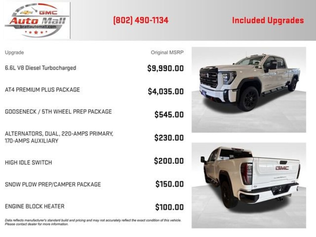 This 2025 Summit White GMC Sierra 3500HD AT4 4WD is well equipped and includes these features and benefits: AT4 Preferred Package (LED Smoked Amber Roof Marker Lamps, Power Sliding Rear Window w/Defogger, and Universal Home Remote), AT4 Premium Plus Package (Off-Road High Clearance Step (LPO) and Power Sunroof), Gooseneck/5th Wheel Prep Package, Preferred Equipment Group 4SB (120-Volt Bed Mounted Power Outlet, 120-Volt Instrument Panel Power Outlet, 2 Charge-Only Rear USB Ports, 2 Charge/Data USB Ports Inside Center Console, 2 USB Ports, 2-Speed Active Transfer Case, Bed View Camera w/2 Trailer Camera Provisions, Bose Premium 7-Speaker Sound System, Deep-Tinted Glass, Electric Rear-Window Defogger, Floor-Mounted Center Console, Front Rain-Sensing Wipers, Gloss Black Header & Grille Insert Bars, HD Surround Vision, Heated 2nd Row Outboard Seats, Heated Driver & Front Outboard Passenger Seats, Keyless Open & Start, LED Cargo Area Lighting, Manual Tilt-Wheel/Telescoping Steering Column, Power Front Windows w/Passenger Express Up/Down, Prem Front Floor Liners w/Removable Carpet Insert, Prem Rear Floor Liners w/Removable Carpet Insert, Push Button Start, Rear Cross Traffic Alert, Rear Wheelhouse Liners, Remote Vehicle Starter System, Safety Alert Seat, SiriusXM w/360L Trial Subscription, Spray-On Pickup Bedliner w/GMC Logo, Steering Wheel Audio Controls, Trailer Camera Provisions, Trailer Side Blind Zone Alert, Ultrasonic Front & Rear Park Assist, Unauthorized Entry Theft-Deterrent System, Ventilated Driver & Front Passenger Seats, Wireless Charging, and Wireless Phone Projection), Snow Plow Prep/Camper Package (220 Amp Alternator), Technology Package (Auto-Dimming Inside Rearview Mirror w/Camera and Multicolor 15 Diagonal Head-Up Display), X31 Off-Road Package (Hill Descent Control), 10-Speed Automatic, 4WD, Jet Black With Kalahari Accents Leather, 10-Way Power Driver Seat Adjuster w/Lumbar, 10-Way Power Passenger Seat Adjuster w/Lumbar, 4-Wheel Disc Brakes, 7 Speakers, ABS brakes, Air Conditioning, Alloy wheels, AM/FM radio: SiriusXM with 360L, Auto High-beam Headlights, Auto-dimming door mirrors, Auto-dimming Rear-View mirror, Automatic Emergency Braking, Automatic temperature control, Brake assist, Buckle to Drive, Bumpers: body-color, Compass, Delay-off headlights, Driver door bin, Driver Memory, Driver vanity mirror, Dual 220-Amps Primary/170-Amps Aux Alternators, Dual front impact airbags, Dual front side impact airbags, Electronic Stability Control, Engine Block Heater, Exhaust Brake, Exterior Parking Camera Rear, Following Distance Indicator, Forward Collision Alert, Front anti-roll bar, Front Bucket Seats, Front Center Armrest, Front dual zone A/C, Front fog lights, Front License Plate Kit, Front Pedestrian Braking, Front reading lights, Front wheel independent suspension, Fully automatic headlights, GMC Premium 13.4 Diagonal Information Display, Heated door mirrors, Heated front seats, Heated rear seats, Heated steering wheel, Heavy-Duty 80 Amp-Hr Battery, High Idle Switch, Hitch Guidance w/Hitch View, Illuminated entry, IntelliBeam Automatic High Beam On/Off, Lane Departure Warning System, Low tire pressure warning, Memory seat, Occupant sensing airbag, Off-Road Suspension, Outside temperature display, Overhead airbag, Overhead console, Panic alarm, Passenger door bin, Passenger vanity mirror, Perforated Front Leather Seat Trim, Pickup Bed, Power door mirrors, Power driver seat, Power passenger seat, Power steering, Power windows, Radio: AM/FM w/Premium GMC Infotainment System, Rain sensing wipers, Rear reading lights, Rear seat center armrest, Rear step bumper, Rear window defroster, Remote keyless entry, Security system, Speed control, Speed-sensing steering, Split folding rear seat, Steering wheel mounted audio controls, Tachometer, Telescoping steering wheel, Tilt steering wheel, Traction control, Trip computer, Turn signal indicator mirrors, Variably intermittent wi