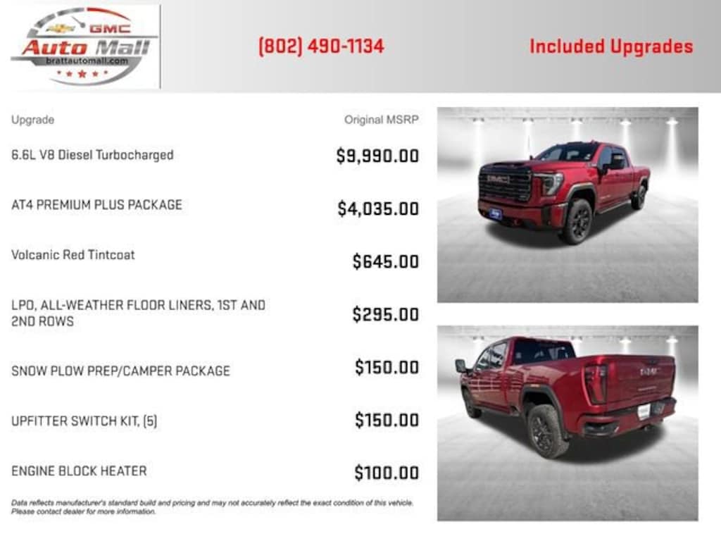 This 2026 Volcanic Red Tintcoat GMC Sierra 3500HD AT4 4WD is well equipped and includes these features and benefits: AT4 Preferred Package (LED Smoked Amber Roof Marker Lamps, Power Sliding Rear Window with Defogger, and Universal Home Remote), AT4 Premium Plus Package (Off-Road High Clearance Step and Power Sunroof), Preferred Equipment Group 4SB (120-Volt Bed Mounted Power Outlet, 120-Volt Instrument Panel Power Outlet, 2 Charge-Only Rear USB Ports, 2 Charge/Data USB Ports Inside Center Console, 2 USB Ports, 2-Speed Active Transfer Case, Bed View Camera with Two Trailer Camera Provisions, Bose Premium 7-Speaker Sound System, Deep-Tinted Glass, Electric Rear-Window Defogger, Floor-Mounted Center Console, Front Rain-Sensing Wipers, Gloss Black Header and Grille Insert Bars, HD Surround Vision, Heated 2nd Row Outboard Seats, Heated Driver and Front Outboard Passenger Seats, Keyless Open and Start, LED Cargo Area Lighting, Manual Tilt-Wheel/Telescoping Steering Column, Power Front Windows with Passenger Express Up/Down, Premium Front Floor Liners with Removable Carpet Insert, Premium Rear Floor Liners with Removable Carpet Insert, Push Button Start, Rear Cross Traffic Alert, Rear Wheelhouse Liners, Remote Vehicle Starter System, Safety Alert Seat, SiriusXM with 360L Trial Subscription, Spray-on Pickup Bedliner with GMC Logo, Steering Wheel Audio Controls, Trailer Camera Provisions, Trailer Side Blind Zone Alert, Ultrasonic Front and Rear Park Assist, Unauthorized Entry Theft-Deterrent System, Ventilated Driver and Front Passenger Seats, Wireless Charging, and Wireless Phone Projection), Snow Plow Prep/Camper Package (220 Amp Alternator), Technology Package (Auto-Dimming Inside Rearview Mirror with Camera and Multicolor 15 Diagonal Head-Up Display), X31 Off-Road Package (Hill Descent Control and Off-Road Suspension), 10-Speed Automatic, 4WD, Jet Black With Kalahari Accents Leather, 10-Way Power Driver Seat Adjuster with Lumbar, 10-Way Power Passenger Seat Adjuster with Lumbar, 4-Wheel Disc Brakes, 7 Speakers, ABS brakes, Air Conditioning, All-Weather Floor Liners with AT4 Logo, Alloy wheels, AM/FM radio: SiriusXM with 360L, Auto High-beam Headlights, Auto-dimming door mirrors, Auto-dimming Rear-View mirror, Automatic Emergency Braking, Automatic temperature control, Brake assist, Buckle to Drive, Bumpers: body-color, Compass, Delay-off headlights, Driver door bin, Driver Memory, Driver vanity mirror, Dual front impact airbags, Dual front side impact airbags, Electronic Stability Control, Emergency communication system: OnStar Services capable, Engine Block Heater, Exhaust Brake, Exterior Parking Camera Rear, Following Distance Indicator, Forward Collision Alert, Front anti-roll bar, Front Bucket Seats, Front Center Armrest, Front dual zone A/C, Front fog lights, Front License Plate Kit, Front Pedestrian Braking, Front reading lights, Front wheel independent suspension, Fully automatic headlights, GMC Premium 13.4 Diagonal Information Display, Heated door mirrors, Heated front seats, Heated rear seats, Heated steering wheel, Heavy-Duty 80 Amp-Hour Battery, Hitch Guidance with Hitch View, Illuminated entry, IntelliBeam Automatic High Beam on/Off, Lane Departure Warning System, Low tire pressure warning, Memory seat, Occupant sensing airbag, Outside temperature display, Overhead airbag, Overhead console, Panic alarm, Passenger door bin, Passenger vanity mirror, Perforated Front Leather Seat Trim, Pickup Bed, Power door mirrors, Power driver seat, Power passenger seat, Power steering, Power windows, Premium audio system: Premium GMC Infotainment System, Radio: AM/FM Stereo with Premium GMC Infotainment System, Rain sensing wipers, Rear reading lights, Rear seat center armrest, Rear step bumper, Rear window defroster, Remote keyless entry, Security system, Speed control, Speed-sensing steering, Split folding rear seat, Steering wheel mounted audio controls, Tachometer, Telescoping stee