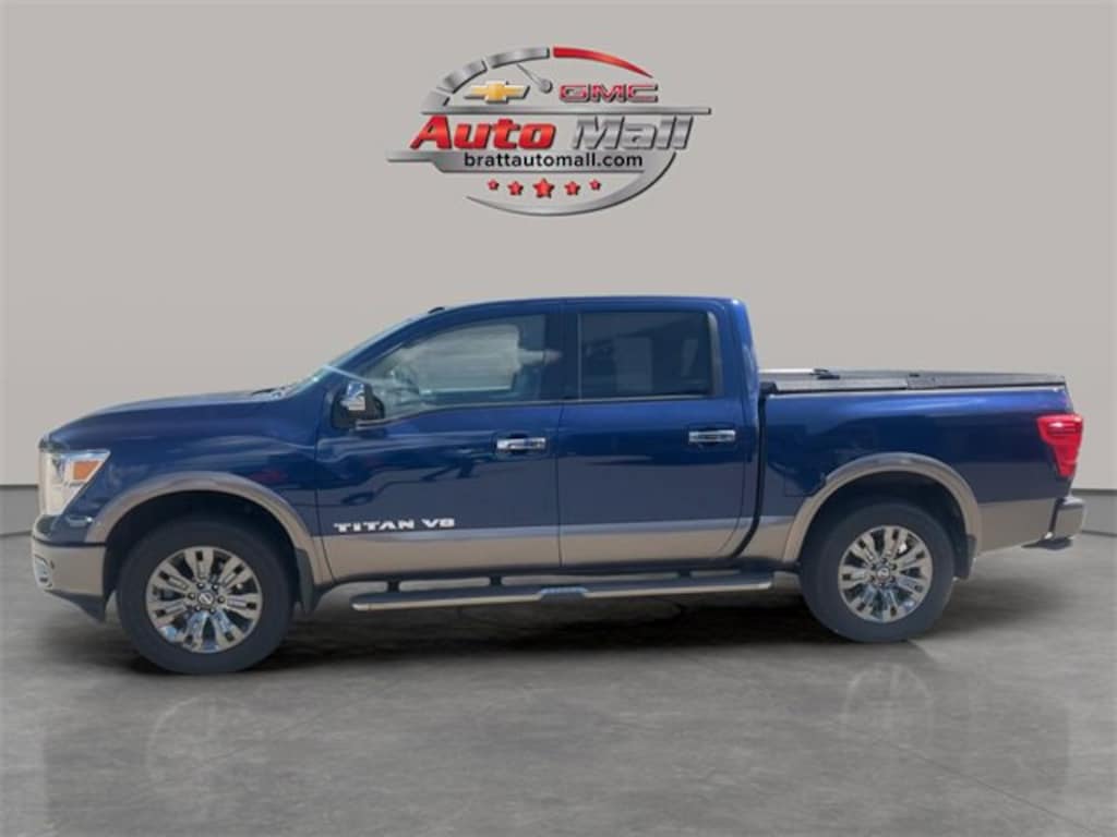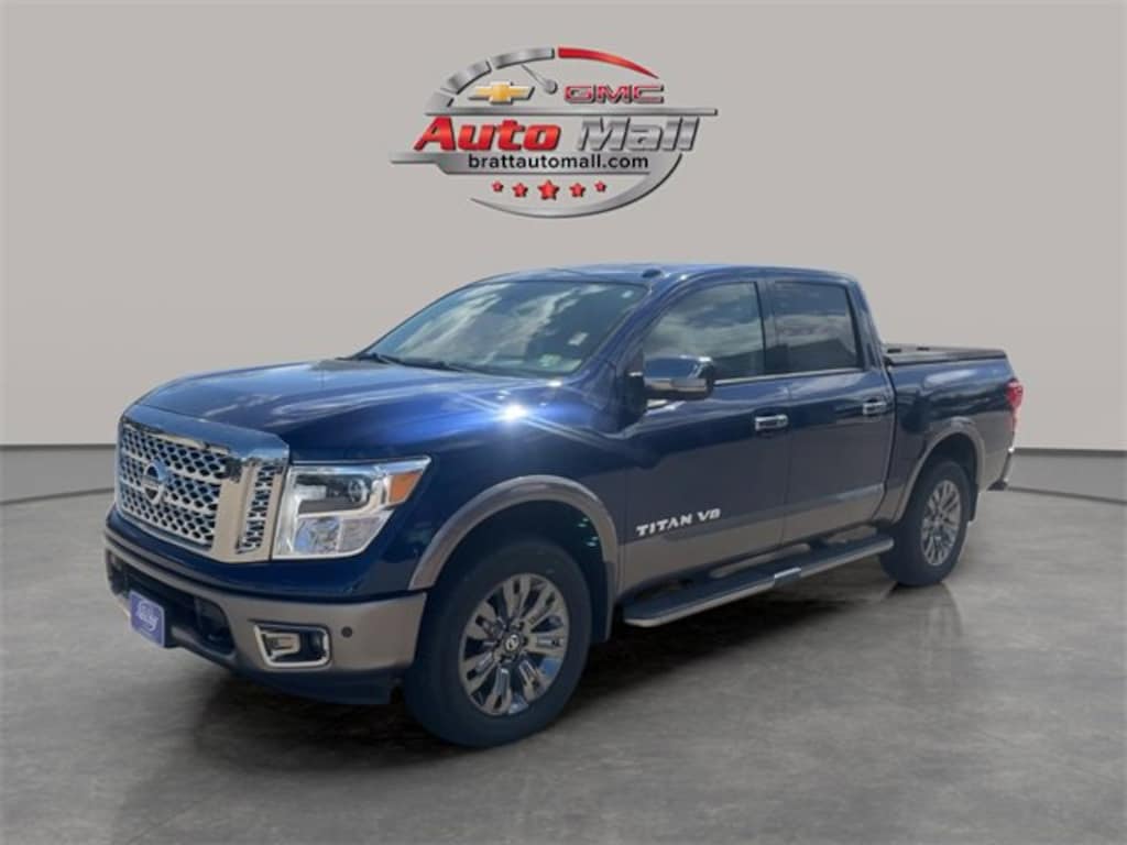 This 2018 Deep Blue Pearl Nissan Titan Platinum Reserve 4WD is well equipped and includes these features and benefits: Platinum Reserve Utility Bed Package (5.5' TITAN Box and Rear Bumper Step (B13)), Platinum Utility Package (TITAN Box), 4WD, 12 Speakers, 2.937 Axle Ratio, 4-Wheel Disc Brakes, ABS brakes, Activation Disclaimer, Air Conditioning, Alloy wheels, AM/FM radio: SiriusXM, Auto tilt-away steering wheel, Auto-dimming door mirrors, Auto-dimming Rear-View mirror, Automatic temperature control, Blind Spot Warning, Brake assist, CD player, Chrome wheels, Compass, Delay-off headlights, Door Sill Kick Plates, Driver door bin, Driver vanity mirror, Dual front impact airbags, Dual front side impact airbags, Electronic Stability Control, Emergency communication system: NissanConnect Services, Floor Mats, Front anti-roll bar, Front Bucket Seats, Front Center Armrest, Front dual zone A/C, Front fog lights, Front reading lights, Front wheel independent suspension, Garage door transmitter: HomeLink, Heated & Cooled Front Captain's Chairs, Heated door mirrors, Heated front seats, Heated rear seats, Heated steering wheel, Illuminated entry, Illuminated running boards, Leather Shift Knob, Leather steering wheel, Low tire pressure warning, Memory seat, Navigation System, NissanConnect Services Powered By SiriusXM, Occupant sensing airbag, Outside temperature display, Overhead airbag, Overhead console, Panic alarm, Passenger door bin, Passenger vanity mirror, Power door mirrors, Power driver seat, Power passenger seat, Power steering, Power windows, Premium Leather Seat Trim, Radio data system, Radio: NissanConnect w/SiriusXM/Navi & Mobile Apps, Rain sensing wipers, Rear anti-roll bar, Rear seat center armrest, Rear step bumper, Rear window defroster, Remote keyless entry, Running Boards w/Dark Chrome, Security system, Speed control, Speed-sensing steering, Speed-Sensitive Wipers, Split folding rear seat, Steering wheel memory, Steering wheel mounted audio controls, Tachometer, Telescoping steering wheel, Tilt steering wheel, Traction control, Trip computer, Turn signal indicator mirrors, Variably intermittent wipers, Ventilated front seats, Voltmeter, and Wheels: 20 x 8 Dark Chrome Clad. CARFAX One-Owner.